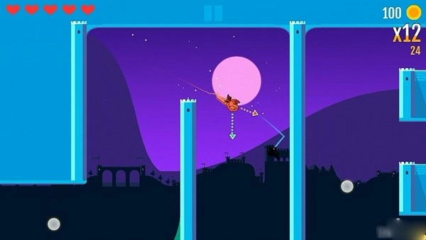 2.你可以在按住一邊屏幕的狀態(tài)下操作另一邊屏幕,用兩個手指頭按住的屏幕(屏幕上的兩個白點)。松開左邊屏幕而不放開右邊屏幕,角色就會保持在慢鏡頭狀態(tài)下朝你調(diào)整的方向飛行。只要不放開右邊屏幕,就可以重復(fù)這個操作。