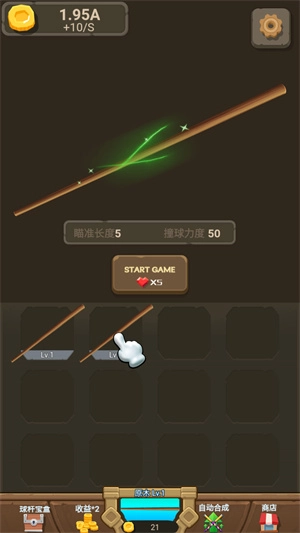 2、球桿的等級(jí)越高,得到的金幣就越多,玩家可以消耗金幣去購(gòu)買球桿,還能開(kāi)啟自動(dòng)合成功能。