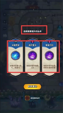 3、當(dāng)出現(xiàn)仙術(shù)提升選項(xiàng)時(shí),依據(jù)自身戰(zhàn)斗風(fēng)格和實(shí)際需求,從【冰錐貫穿】【連環(huán)雷法】【雷霆萬(wàn)鈞】中挑選合適的仙術(shù),以此提升戰(zhàn)力。