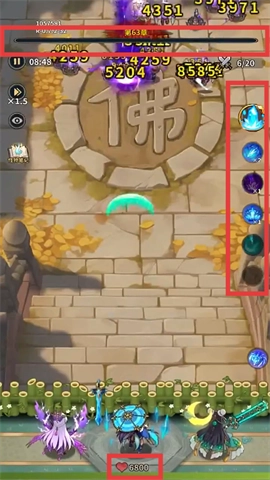 2、戰(zhàn)斗過(guò)程中,關(guān)注紅框內(nèi)的關(guān)卡進(jìn)度條、怪物血量數(shù)值以及我方角色生命值,合理運(yùn)用右側(cè)紅框內(nèi)的技能圖標(biāo),擊敗怪物以推進(jìn)關(guān)卡進(jìn)程。