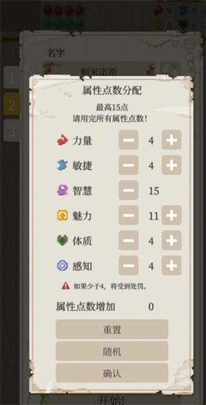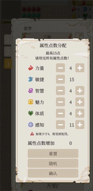 3、一開始可以得到初始buff加成,并且初始屬性分配有36點,如果屬性低于4點會有懲罰。