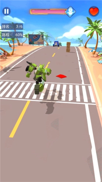 1、開啟汽車人變形熱血賽車游戲之旅,用滑動(dòng)屏幕的方式操控汽車人移動(dòng);