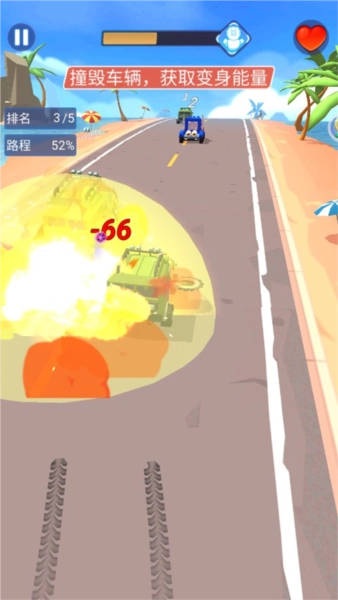 2、你需要撞毀其他車輛,爭(zhēng)奪比賽的勝利,并獲得變身能力;