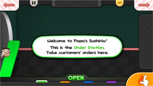 4、接下來就會(huì)為玩家介紹壽司店,點(diǎn)擊右下角的按鈕;進(jìn)入訂單站,顧客的訂單都在這里;