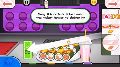 6、顧客的訂單就會(huì)出現(xiàn)在右側(cè),玩家需要根據(jù)顧客的訂單制作出壽司以及飲品,然后點(diǎn)擊下方的按鈕;