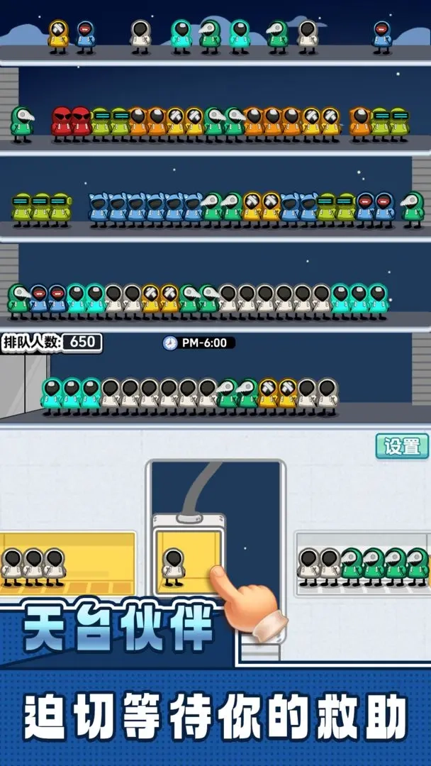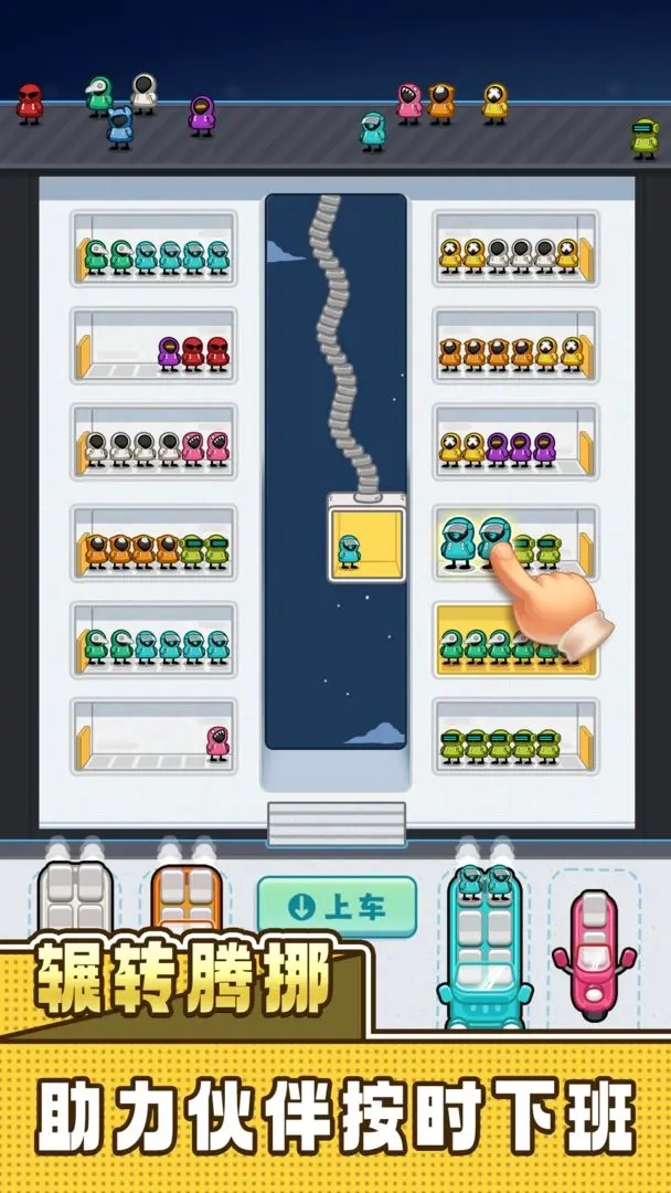 1. 熟悉游戲核心玩法:這款游戲的設計靈感來源于打工人的日常,玩家需要在電梯場景中操控不同顏色的小人,把他們送到對應顏色的汽車上。借助顏色匹配的方式完成消除,最終幫助打工小人們順利結束工作回家。