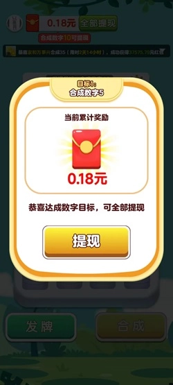這是真的,新用戶合成數(shù)字5就能提現(xiàn)0.18元,合成數(shù)字10的話,可以提現(xiàn)0.42元。