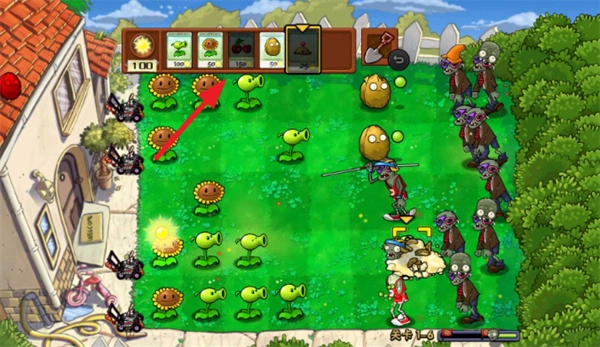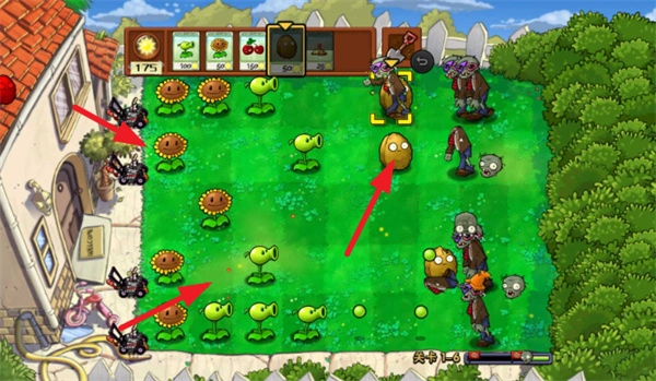 3、僵尸總是會快速來襲,一般建議讓堅果放在前面,向日葵放在最后面,中間可以放一些輸出植物。