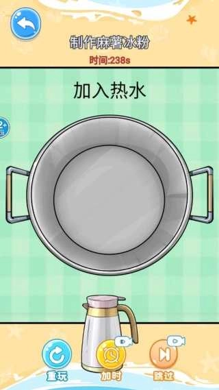 2、制作麻薯冰粉的第一步就是燒水,點(diǎn)擊水壺往鍋中加入熱水就可以繼續(xù)任務(wù)了。