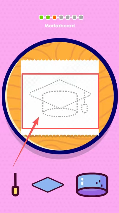 3、粉色背景中央橙圈內(nèi),按學(xué)士帽虛線輪廓用工具描繪,下方三圖標(biāo)輔助操作。