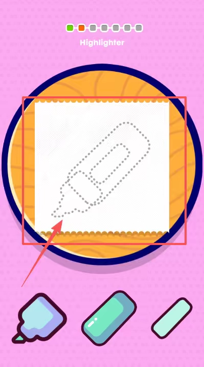 1、在粉色背景的畫板區(qū)域,使用熒光筆輪廓內(nèi)工具進(jìn)行繪畫填充,下方的三個圖標(biāo)為操作工具。
