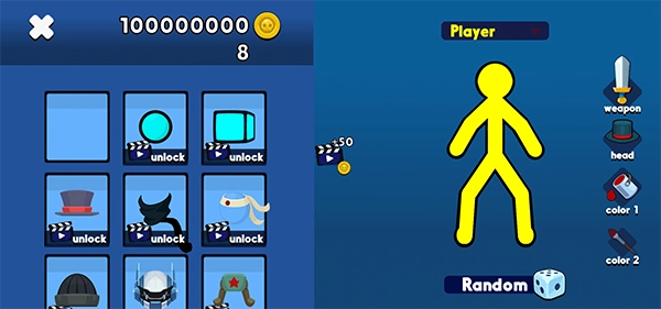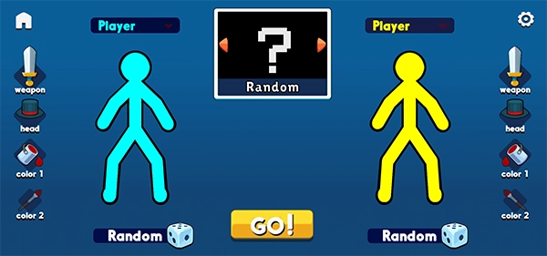 4、屏幕左右兩側(cè)分別用于自定義兩位玩家的角色外觀、顏色及初始武器配置,打造屬于你的專(zhuān)屬火柴戰(zhàn)士。