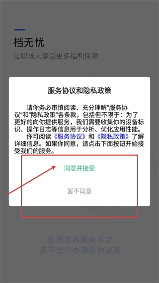1、初次使用檔無憂時,需點擊【同意并接受】按鈕,在同意《服務(wù)協(xié)議》與《隱私政策》后,方可正常使用軟件的各項功能。