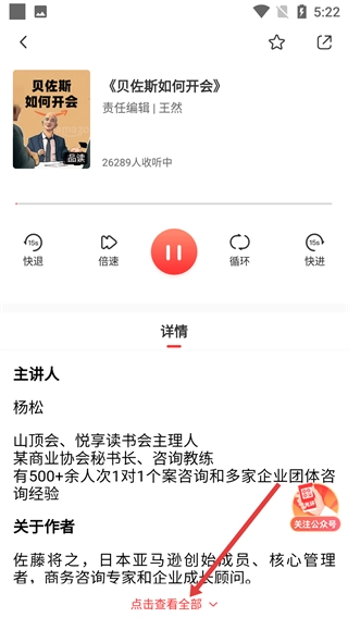 4、進(jìn)入品讀詳情頁后,可播放音頻,點(diǎn)擊【點(diǎn)擊查看全部】,了解主講人、作者等詳細(xì)信息,深入學(xué)習(xí)品讀內(nèi)容。
