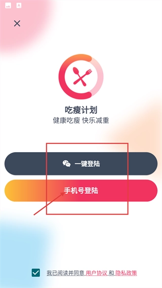 在吃瘦計(jì)劃的登錄頁(yè)面,先勾選同意相關(guān)協(xié)議,接著點(diǎn)擊“手機(jī)號(hào)登錄”按鈕,即可進(jìn)入手機(jī)驗(yàn)證碼登錄的流程。