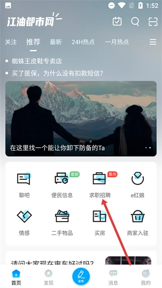 1、打開(kāi)【江油都市網(wǎng)】首頁(yè)后,找到并點(diǎn)擊【求職招聘】的功能入口,即可進(jìn)入招聘板塊。