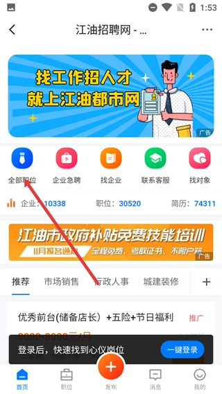 2、在【江油招聘網(wǎng)】頁(yè)面,點(diǎn)擊【全部職位】,查看所有招聘崗位信息。