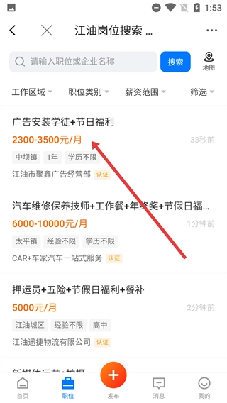 3、在【江油崗位搜索】頁(yè)面,瀏覽崗位列表,選擇感興趣的職位,如【廣告安裝學(xué)徒+節(jié)日福利】。
