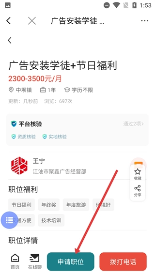 4、進(jìn)入職位詳情頁(yè)后,可點(diǎn)擊【申請(qǐng)職位】按鈕,申請(qǐng)?jiān)撜衅笉徫弧?