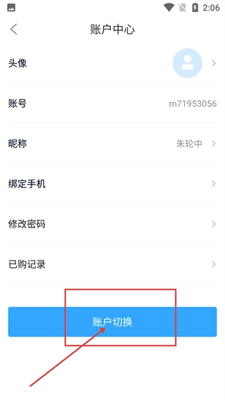 3、在【賬戶中心】頁面,可管理頭像、昵稱、綁定手機等信息,點擊底部【賬戶切換】按鈕,即可進入用戶切換流程。