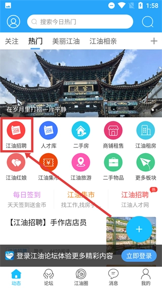 1、在首頁(yè)找到【江油招聘】的功能入口并點(diǎn)擊,即可進(jìn)入招聘板塊。