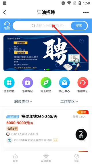 2、在【江油招聘】頁(yè)面,點(diǎn)擊搜索框,輸入關(guān)鍵詞可搜索相關(guān)職位。