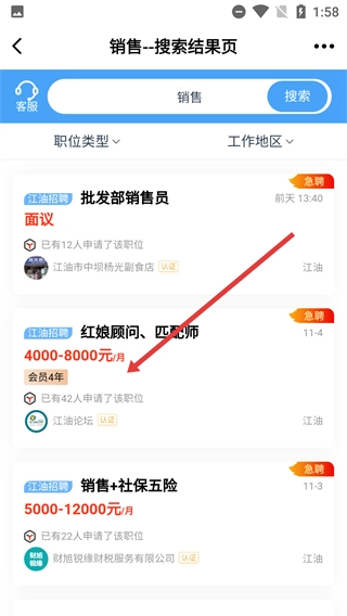 3、在搜索結(jié)果頁(yè),瀏覽崗位列表,選擇感興趣的職位,如【紅娘顧問(wèn)、匹配師】。