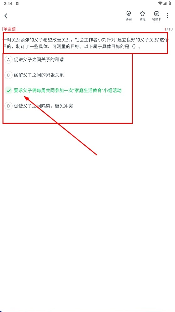 3、在答題頁面,完成單選題作答,如第一題選擇“要求父子倆每周共同參加一次‘家庭生活教育’小組活動”,第二題選擇“性別視角”。