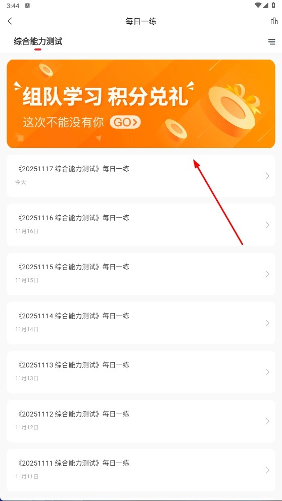 2、在每日一練頁面,選擇當天的練習內(nèi)容,如《20251117綜合能力測試》每日一練,進入答題頁面。