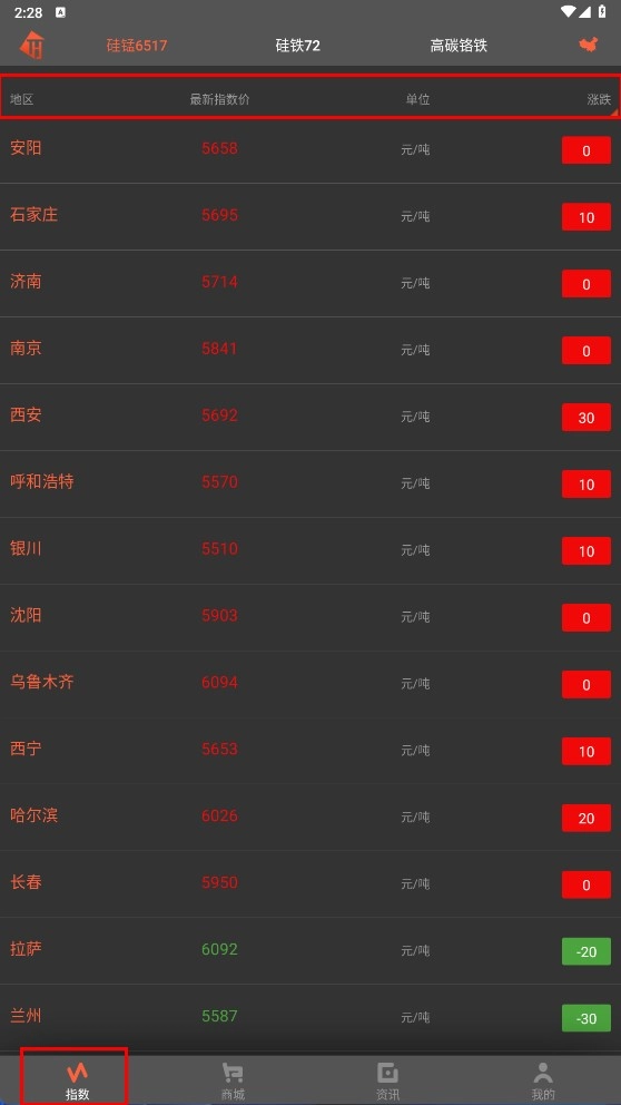 1、進(jìn)入【指數(shù)頁(yè)面】,查看各地區(qū)硅錳等鐵合金類(lèi)產(chǎn)品的最新指數(shù)價(jià)格、計(jì)價(jià)單位以及價(jià)格漲跌變動(dòng)情況。