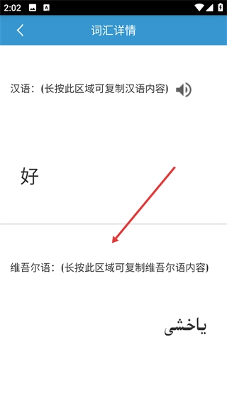 4、在詞匯詳情頁面查看漢語和維吾爾語的詞匯內(nèi)容,完成詞匯查詢操作。