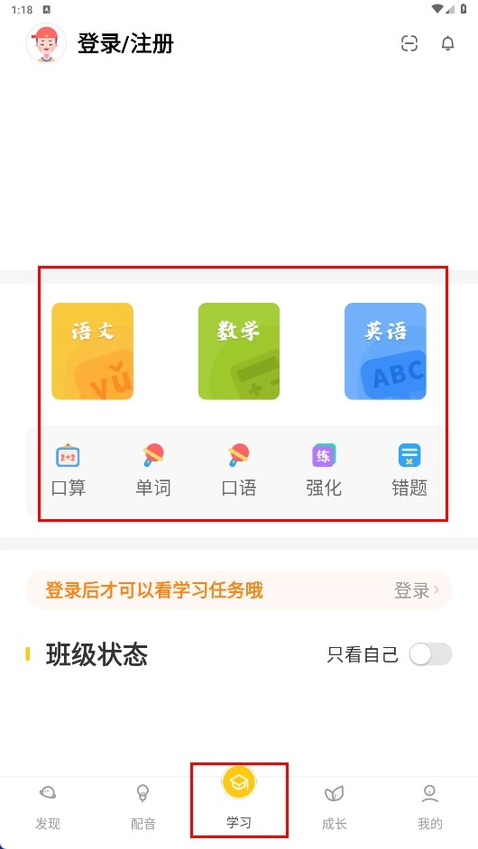 4、登錄后點擊【學(xué)習(xí)-功能按鈕】,可選擇語文、數(shù)學(xué)、英語等學(xué)科模塊進(jìn)行學(xué)習(xí)。