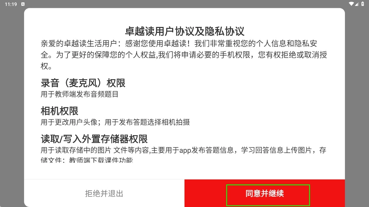 1、點(diǎn)擊【同意并繼續(xù)】按鈕,確認(rèn)已同意卓越讀用戶協(xié)議及隱私協(xié)議。