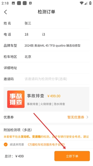 3、在檢測訂單界面填寫姓名、品牌車型、檢車地區(qū)、詳細地址等信息。