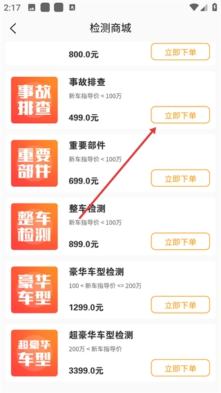 2、在檢測商城選擇【事故排查】服務(wù),點擊【立即下單】,進入檢測訂單界面。