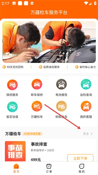 1、在萬疆檢車服務(wù)平臺首頁,點擊【萬疆檢車-更多】選項,即可進入檢測商城頁面。