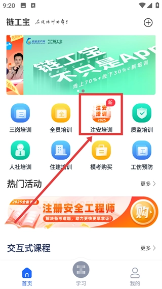 1、打開(kāi)鏈工寶首頁(yè)后,找到并點(diǎn)擊【注安培訓(xùn)】圖標(biāo),即可進(jìn)入注冊(cè)安全工程師課程推薦頁(yè)面。