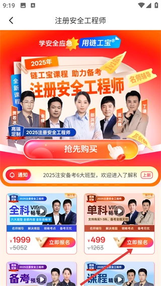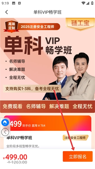 2、在注冊(cè)安全工程師課程頁(yè)面,點(diǎn)擊【單科VIP暢學(xué)班】的立即報(bào)名按鈕,進(jìn)入該課程詳情頁(yè)面。