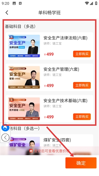 4、在科目選擇頁(yè)面,選擇基礎(chǔ)科目和專業(yè)科目后,點(diǎn)擊【確定】按鈕,完成報(bào)名操作。