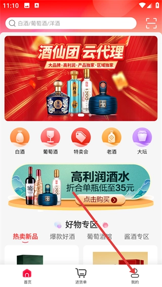 1、在酒仙團(tuán)首頁點(diǎn)擊右下角的【我的】按鈕,進(jìn)入個(gè)人功能頁面,即可開啟賬號相關(guān)的操作流程。