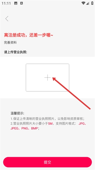4、在資質(zhì)完善頁面,點(diǎn)擊營業(yè)執(zhí)照上傳區(qū)域的【+】號,按要求上傳清晰且小于5M的JPG/JPEG/PNG/BMP格式執(zhí)照后點(diǎn)擊【提交】。