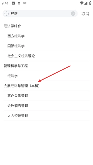 3、在搜索界面輸入關(guān)鍵詞“經(jīng)濟(jì)”,選擇目標(biāo)學(xué)科“會(huì)展經(jīng)濟(jì)與管理(本科)”。