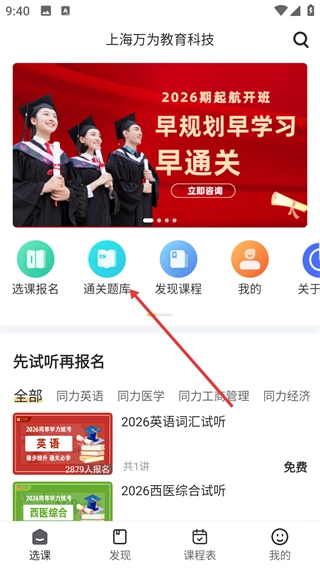 1、點(diǎn)擊【通關(guān)題庫(kù)】選項(xiàng),即可進(jìn)入題庫(kù)界面。