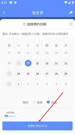 3、在日期選擇界面選擇合適的預(yù)約日期,如“明”日。