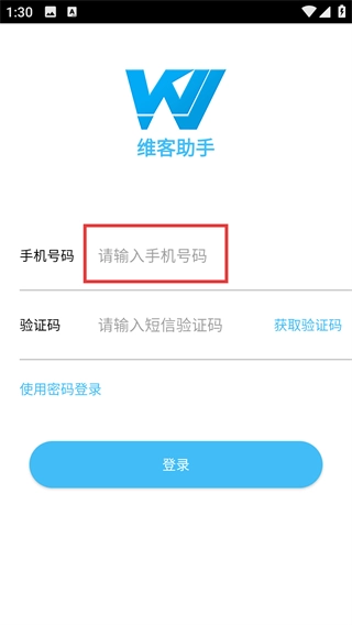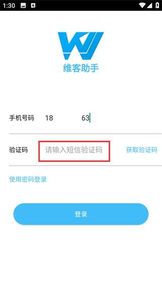 2、在驗(yàn)證碼登錄頁面填寫手機(jī)號碼。