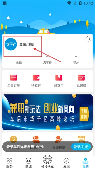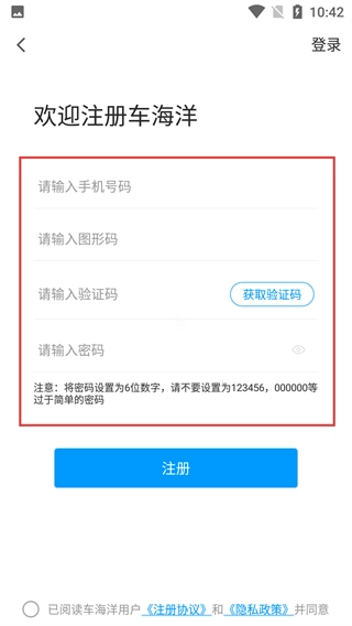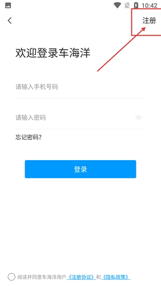 在【我的】頁面點(diǎn)擊【登錄/注冊】區(qū)域,即可進(jìn)入車海洋的登錄界面,該界面支持多種登錄方式供用戶選擇操作。