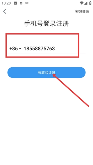 3、在手機號登錄注冊頁面,輸入手機號后點擊【獲取驗證碼】,進入驗證碼輸入頁面。