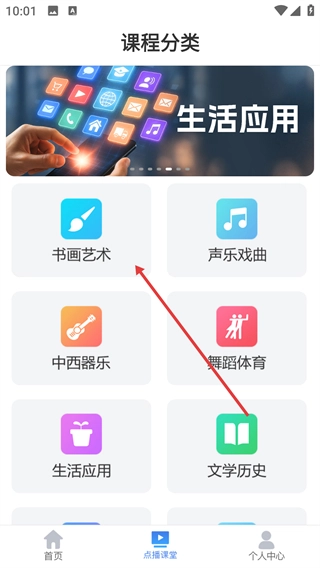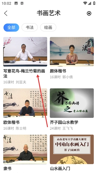 2、在課程分類界面選擇【書畫藝術(shù)】分類,進入書畫藝術(shù)課程列表頁面。