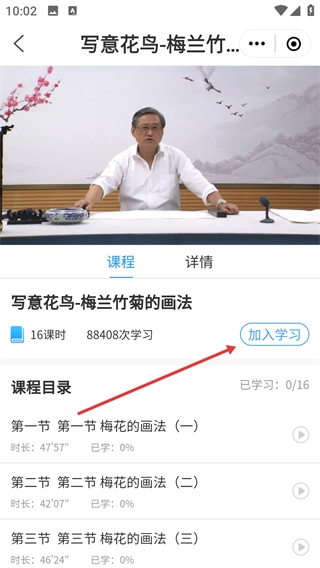 3、在書畫藝術(shù)課程列表中選擇【寫意花鳥-梅蘭竹菊的畫法】課程,進入其詳情頁面。
