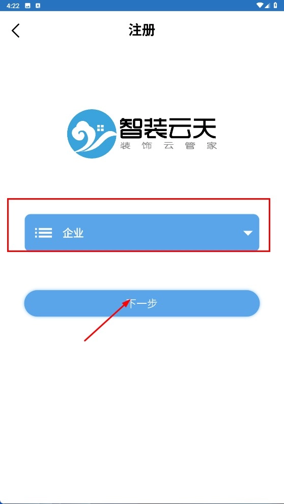 2、在注冊(cè)頁(yè)面,選擇“企業(yè)”類(lèi)型,點(diǎn)擊【下一步-按鈕】。